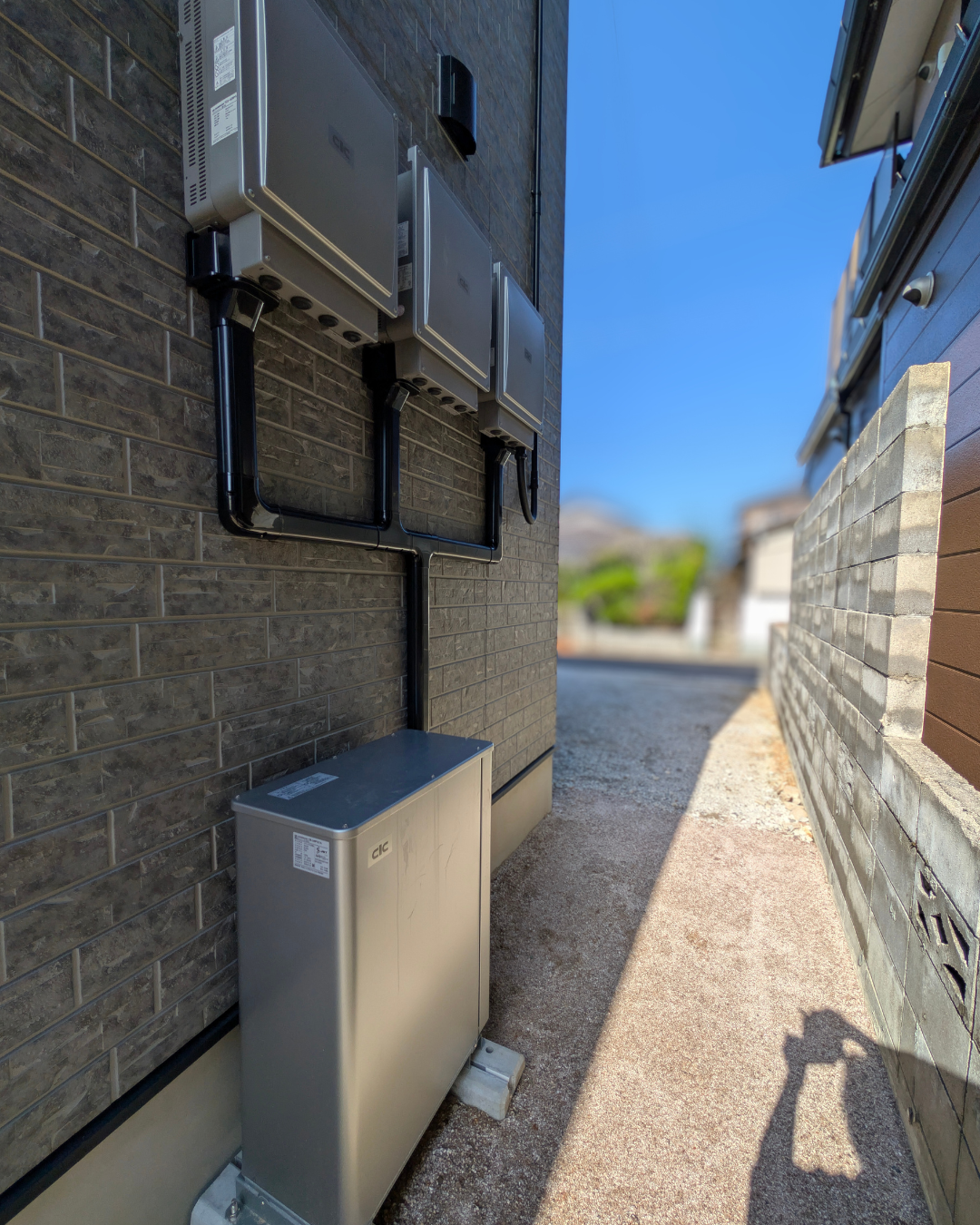 蓄電池は温度が上がらない場所に設置するのが良いそうで、北側は今回は正面になるので置きたくないよね~ということで東側に設置!